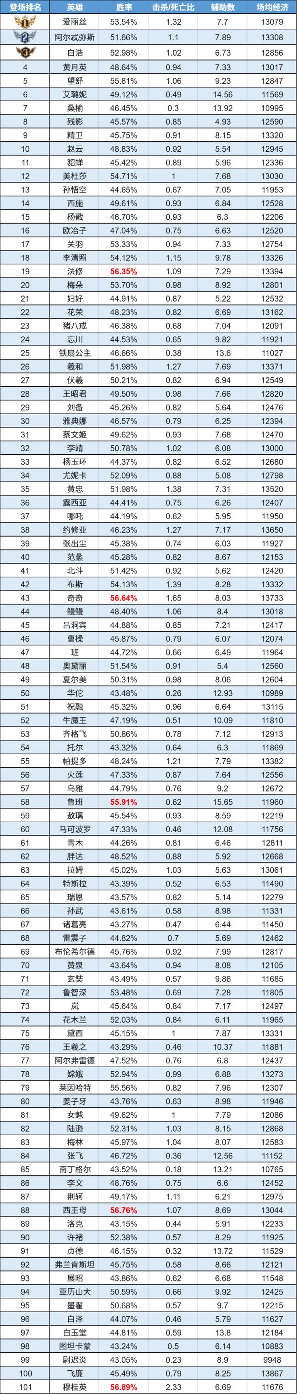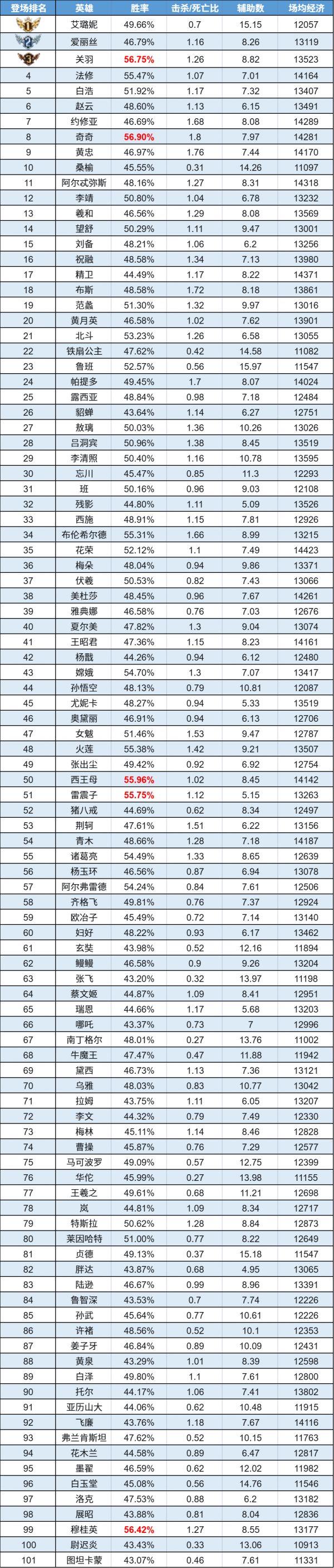 排序:按登场率高低排序,标红为胜率前5