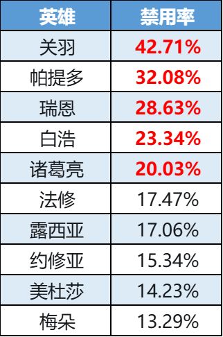 禁用率榜-关羽冲上榜一,瑞恩排名上升