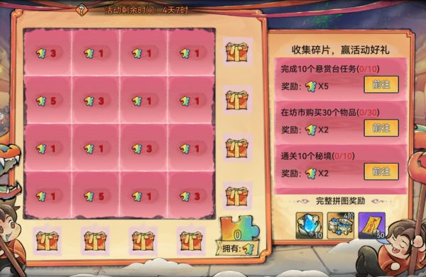 活动期间,祖师完成任务可获得拼图碎片,使用拼图碎片可解锁拼图。
