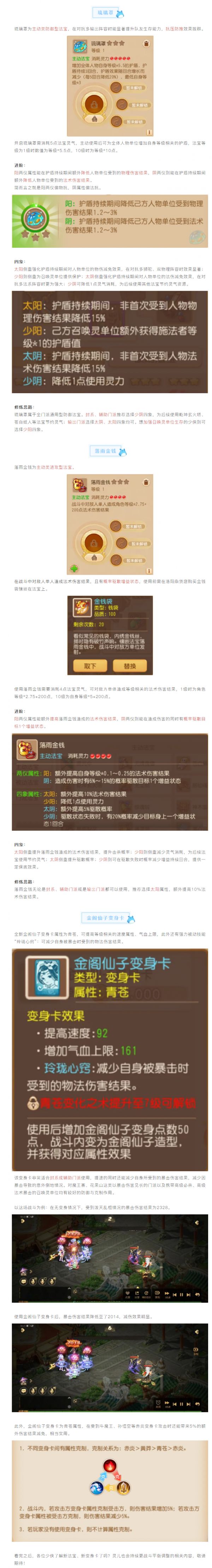 万众瞩目的年末战斗平衡调整终于在部分服务器开启测试了,大家是不是很期待呢?此外,全新法宝落雨金钱、琉璃罩以及金阁仙子变身卡等内容也已经全服实装,各位少侠可以先行体验了!新法宝适合在哪些场合使用,四象两仪怎么选,新变身卡效果如何?且看灵儿逐一解析!