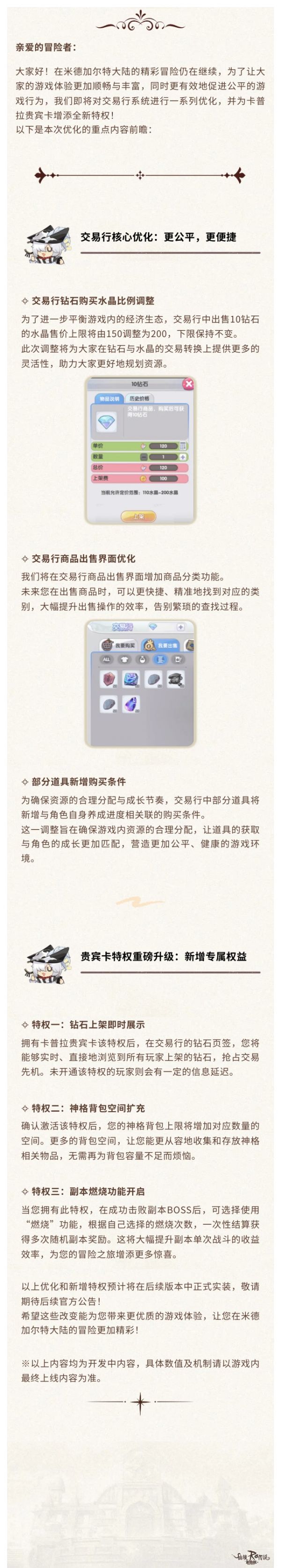 大家好!在米德加尔特大陆的精彩冒险仍在继续,为了让大家的游戏体验更加顺畅与丰富,同时更有效地促进公平的游戏行为,我们即将对交易行系统进行一系列优化,并为卡普拉贵宾卡增添全新特权!