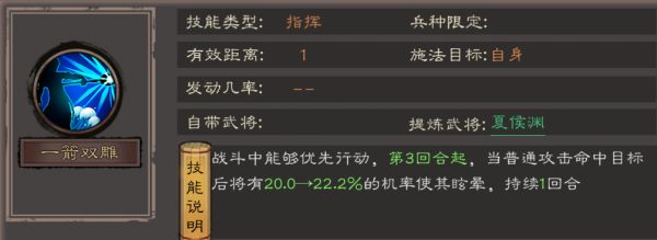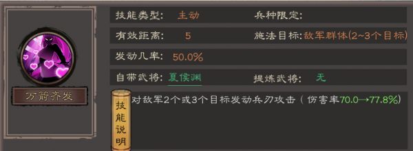 • 效果:对敌军群体造成兵刃伤害(伤害率70.0→77.8%),是夏侯渊的核心输出手段,能快速压低敌方血线。