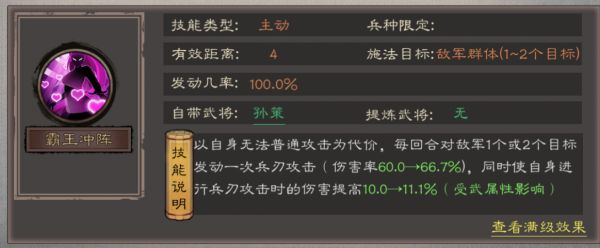 孙策定位是核心输出型武将(T1梯队),自带技能“霸王冲阵”是他的核心卖点: