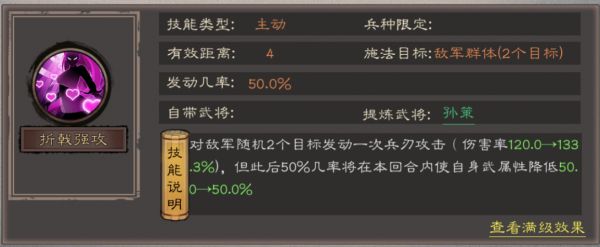 • 优点是伤害倍率高,堪称主动兵刃战法的天花板。由于会在本回合降低自身武力,所以一定要带在第三个技能格子。并且反击体系武将千万不要用!