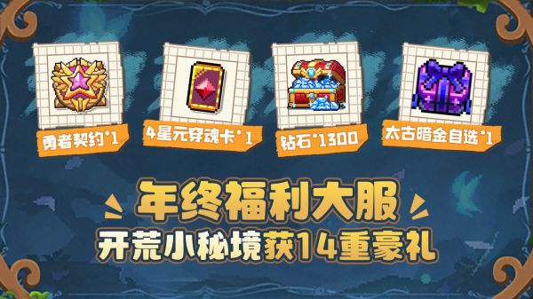 在年度福利大服通关小秘境,即可领取勇者契约、四星元穿魂卡、1300钻石、太古暗金自选等等共14重好礼!