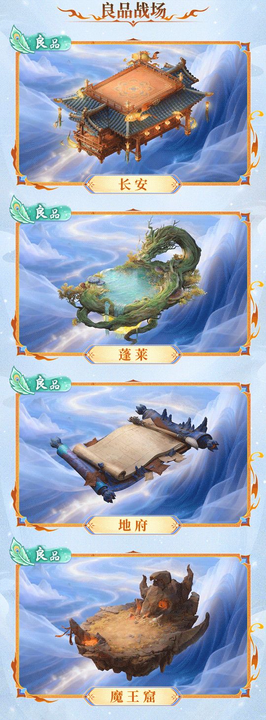 良品战场系列良品战场涵盖长安、蓬莱、地府、魔王窟四大经典场景,朱楼画栋的长安尽显大唐盛世繁华;“有龙则灵”的蓬莱透着缥缈仙气,肃穆神秘的地府与粗犷霸气的魔王窟也各具独特氛围感,每一处场景都能带来不一样的沉浸式对阵体验。
