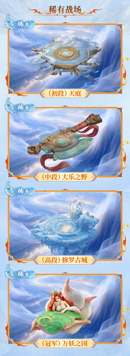 稀有战场则与段位紧密绑定,是实力的专属荣耀象征:初段解锁庄严气派的天庭,中段邂逅奇诡幻域的大乐之野,高段踏入战意凛冽的修罗古城,唯有冠军才能解锁万妖齐聚的恢弘万妖之国。段位越高,战场的视觉震撼力也越强,让实力与荣耀一同展现。