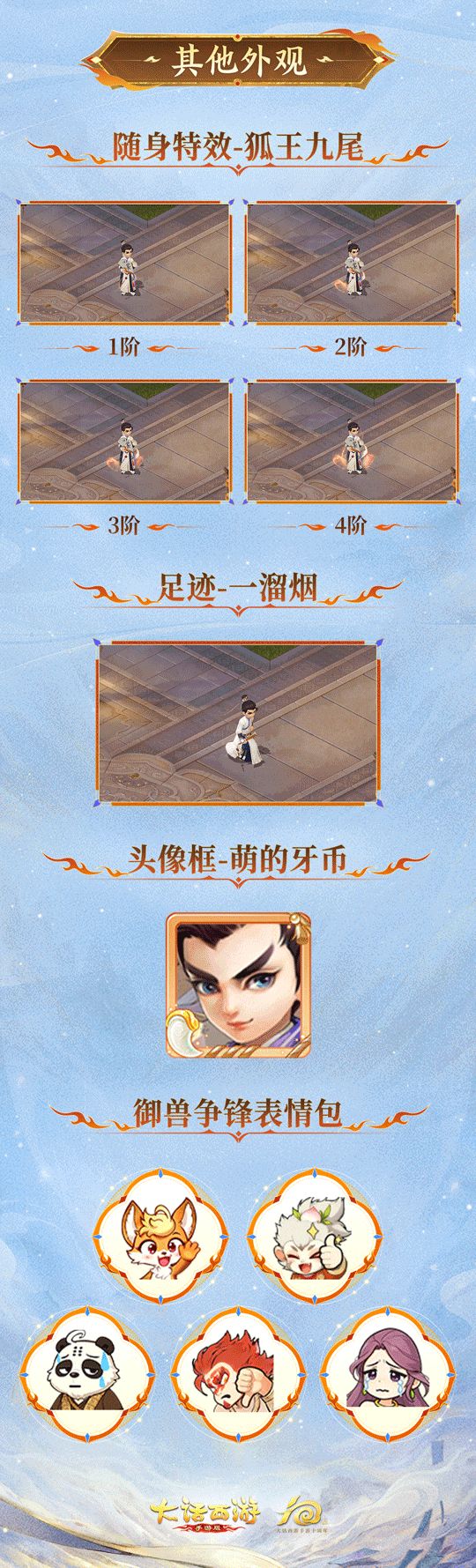随身特效“狐王九尾”分为4阶设计,九尾狐影会随行动动态变幻,灵动又仙气;足迹“一溜烟”自带飘逸感,行走间尽显潇洒;头像框“萌的牙币”以萌趣设计搭配个性头像,颜值瞬间升级;还有多款御兽争锋专属表情包,让游戏内的互动也充满趣味。