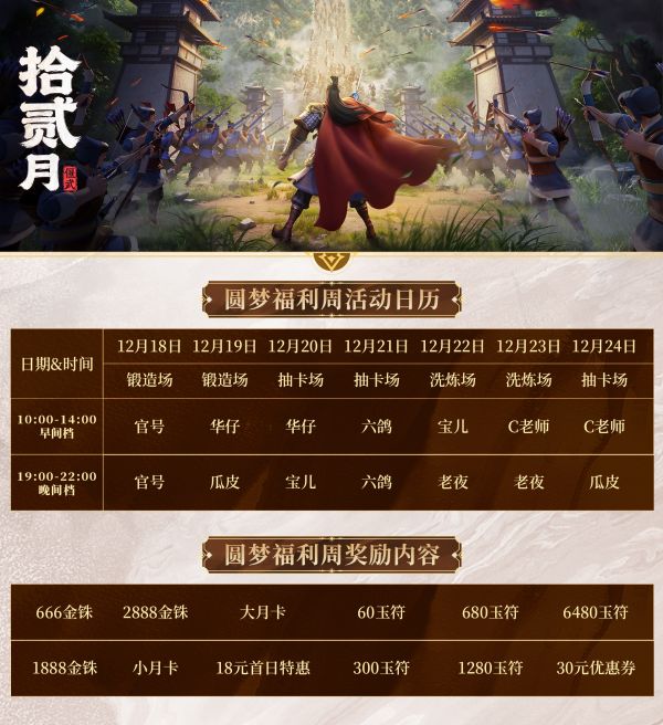主公们注意好时间哦,12月18日10:00准时开启 「圆梦福利周」,来偃武直播间参与活动吧!