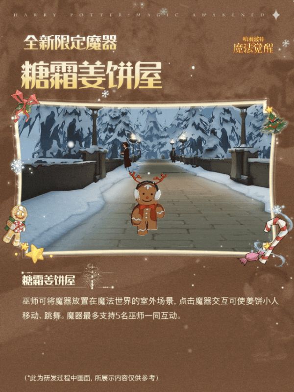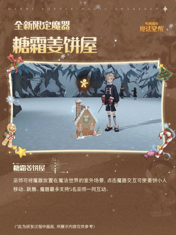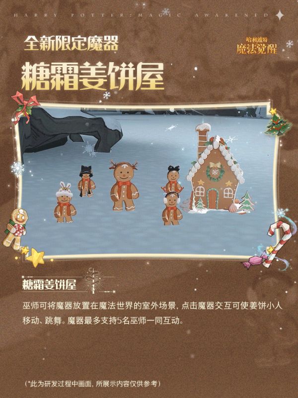 -巫师可将魔器放置在魔法世界的室外场景,点击魔器交互可使姜饼小人移动、跳舞。魔器最多支持5名巫师一同互动。