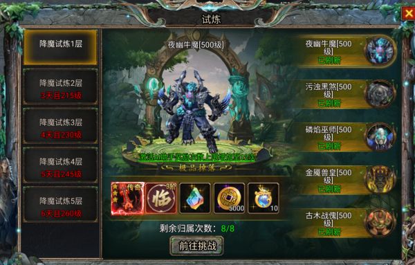 降魔试炼每日归属次数为 8次,层级根据玩家转生开启,主要掉落高阶装备和真言装备。玩家要根据自身等级选择合适层级挑战,注意合理运用技能和走位,确保在有限次数内获取最大收益。