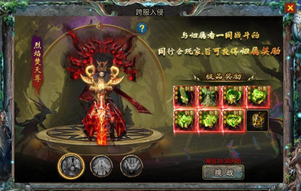 跨服入侵活动在开服第二天每天 20:30 开启,每人每次只允许进入一张地图,击杀归属者可抢夺怪物归属。参与该活动时,要提前了解地图情况,与队友密切配合,制定抢夺归属和防守的策略,争取获得传奇武器、装备强化石等丰厚奖励。