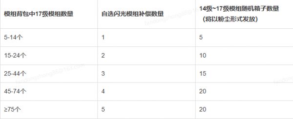 我们将在1月18日24点导出线上数据,根据您届时模组背包中的17级模组数量,进行额外的闪光模组自选、14级~17级模组随机箱子补偿;其中,闪光模组自选补偿数量最大为5个,模组随机箱补偿最大数量为20个。具体补偿规则如下:
