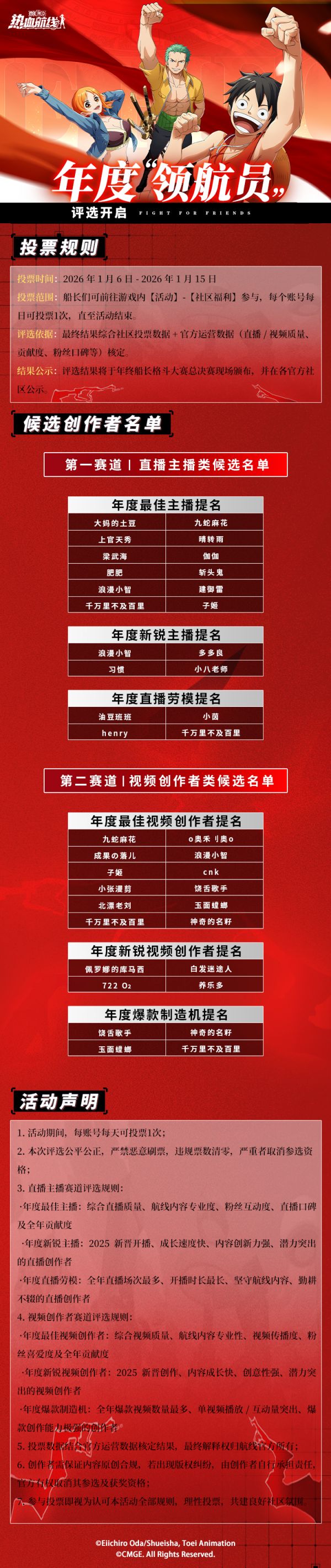 航海王热血航线 2025 年度优秀创作者评选现已开启!本次评选分为「直播主播」「视频创作者」两大核心赛道,6 大重磅奖项!