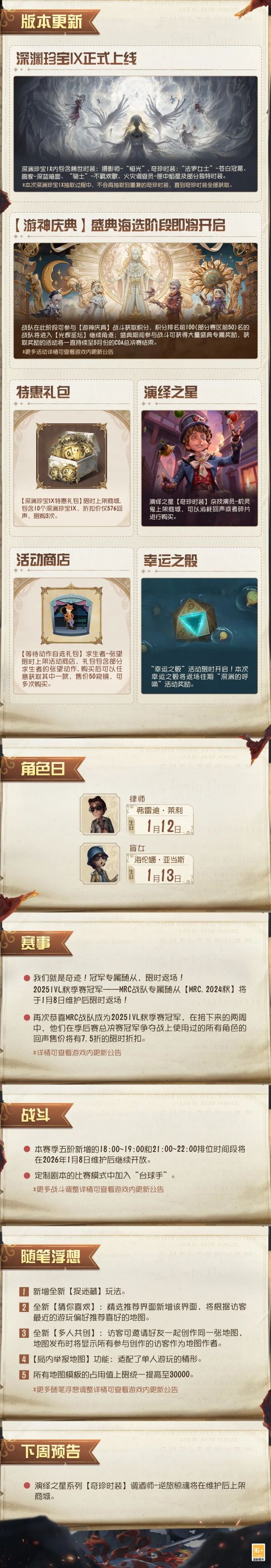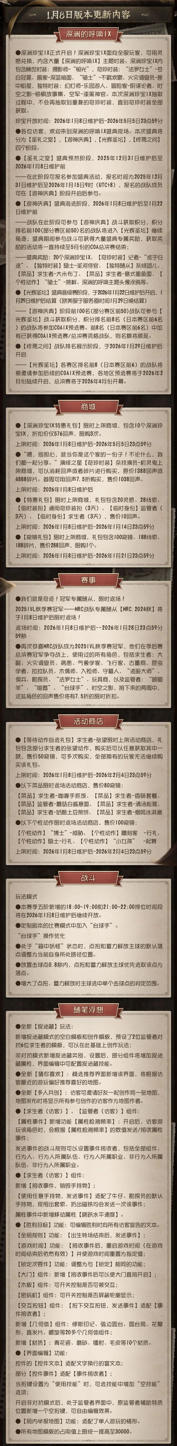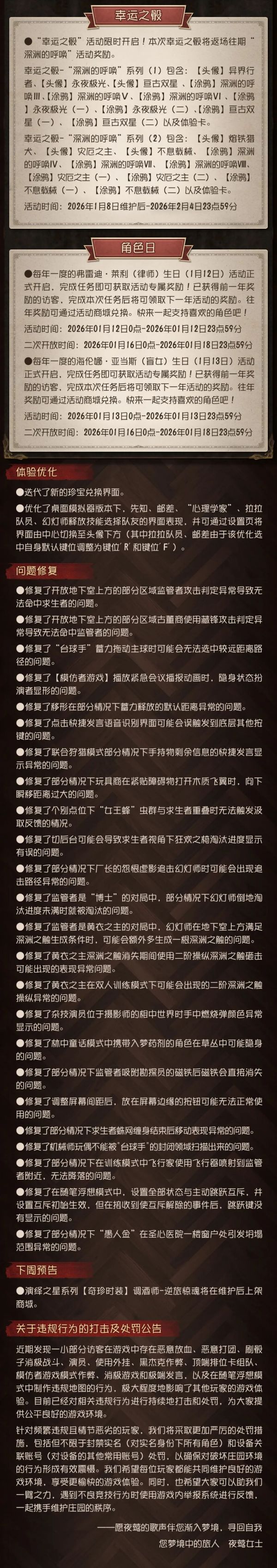《第五人格》2026年1月8日维护公告