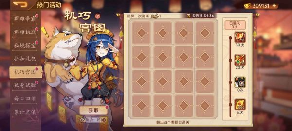 活动内容:活动期间,可通过消耗机关钥匙进行翻牌,翻到4个曹操即可进入下一关卡,通关关卡次数达到目标值即可获得奖励。
