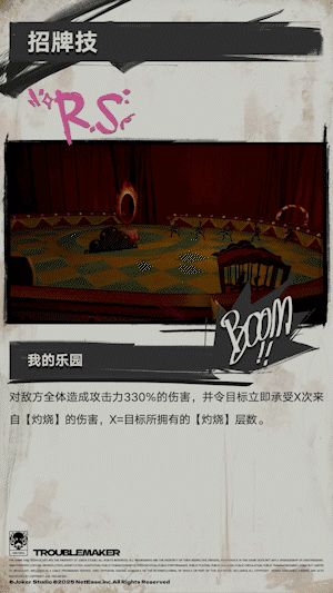 对敌方全体造成攻击力330%的伤害,并令目标立即承受X次来自【灼烧】的伤害,X=目标所拥有的【灼烧】层数。