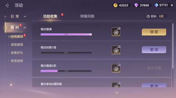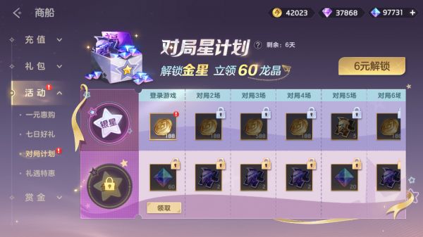 完成对局任务,提升等级免费获取英雄碎片、金币,付费6元解锁金星可以获得龙晶*120、龙魂祈福卡、皮肤碎片。