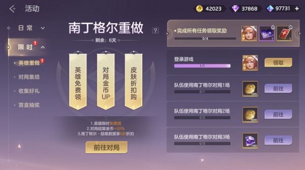 南丁格尔焕新归来赠好礼!参与对局,对局结算金币+50%,完成全部任务可以获得英雄南丁格尔、专属皮肤6折折扣券、排位守护卡*1。