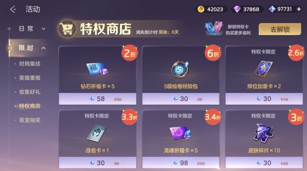 解锁特权卡,享受超值折扣,龙魂祈福卡、排位加星卡、皮肤碎片、改名卡等你来购。