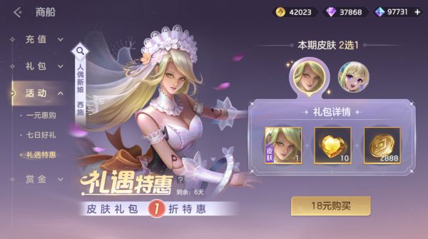 礼遇皮肤礼包限时1折,西施·人偶新娘、王昭君·灵动舞步超值2选1。