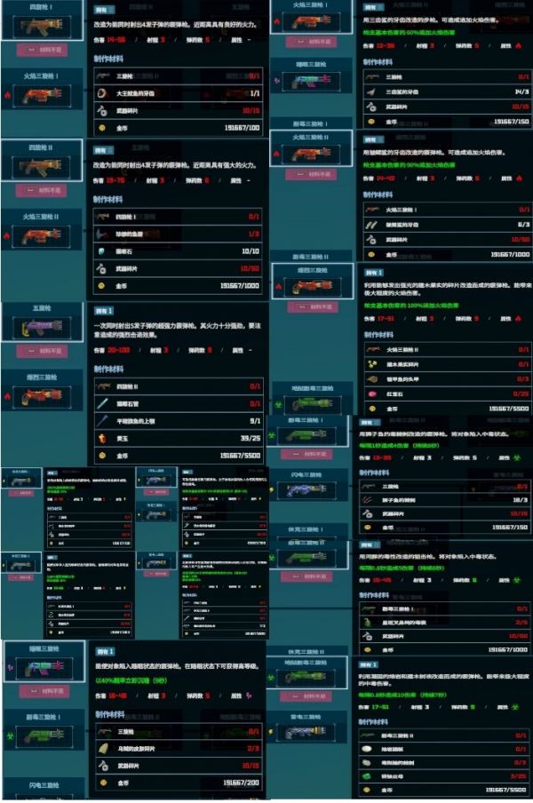 次分支电和休克次分支合成的最终阶段,结合二者的特点,传导伤害+减速,伤害方面是能打出62的总伤,然而这个伤害并不能全部作用在一条鱼上。该分支材料难刷,枪的强度又低,要伤害没伤害,要控制控制也一般般,属于是弟中弟,路边一条,不搞全收集的话没必要制作