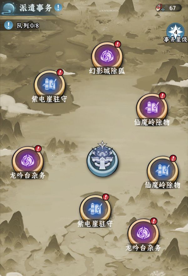 通过升级宗门大殿可提升事务星级,接取更高等级的事务,等级越高的事务对弟子灵根资质要求越高。