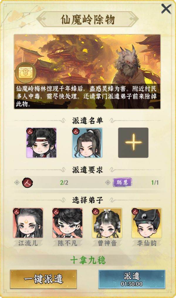 派遣弟子进行任务时,会对弟子种族、灵根资质有所要求,最多可派出三名弟子。符合的条件越多则完成率越高,完成率较低时则派遣事务有几率失败,失败后只能获得部分奖励。