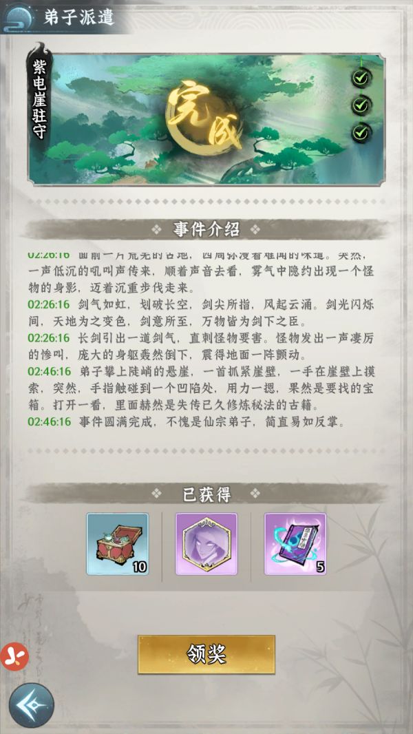 完成派遣任务后,可获得对应派遣奖励,根据事件类型与品质的不同,获得奖励也会有所不同。同时,在完成界面还可查看派遣事件的整体过程,助掌教师叔了解宗门弟子在此次任务中的经历。