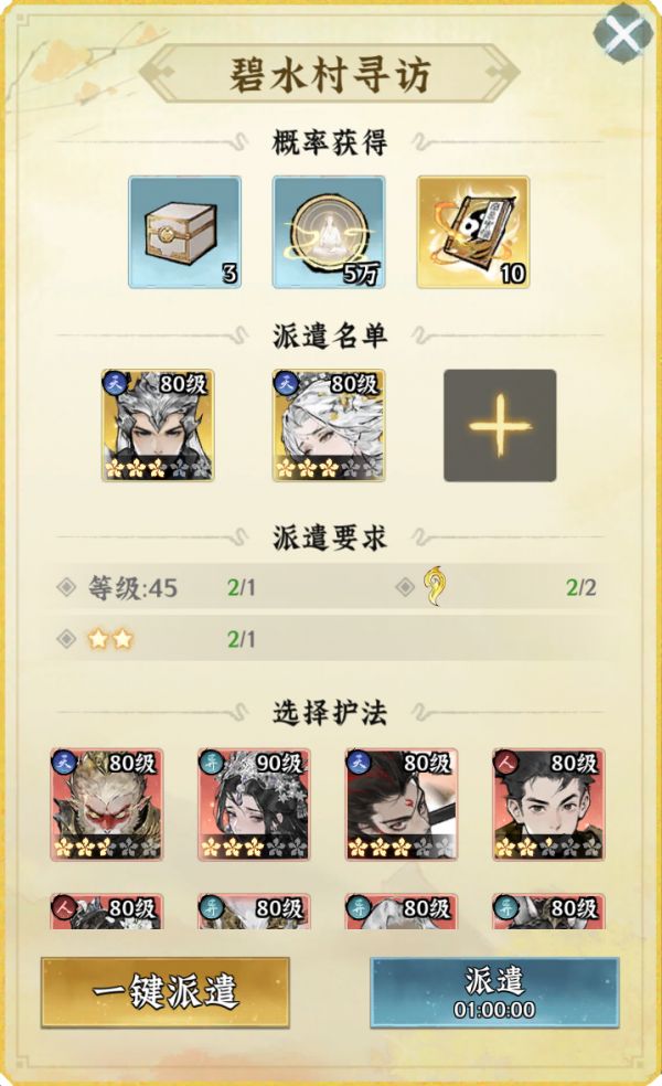 进行弟子派遣时,即使不完全符合条件,也可正常进行派遣任务,只会影响完成几率。而进行护法派遣时,需要严格符合要求,否则无法进行派遣。