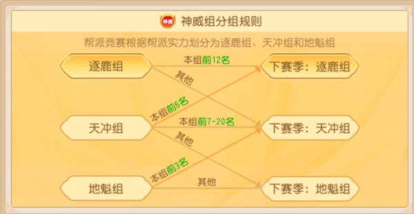 新赛季帮战将划分为逐鹿、天冲、地魁三个组别,形成“金字塔式”竞赛结构: