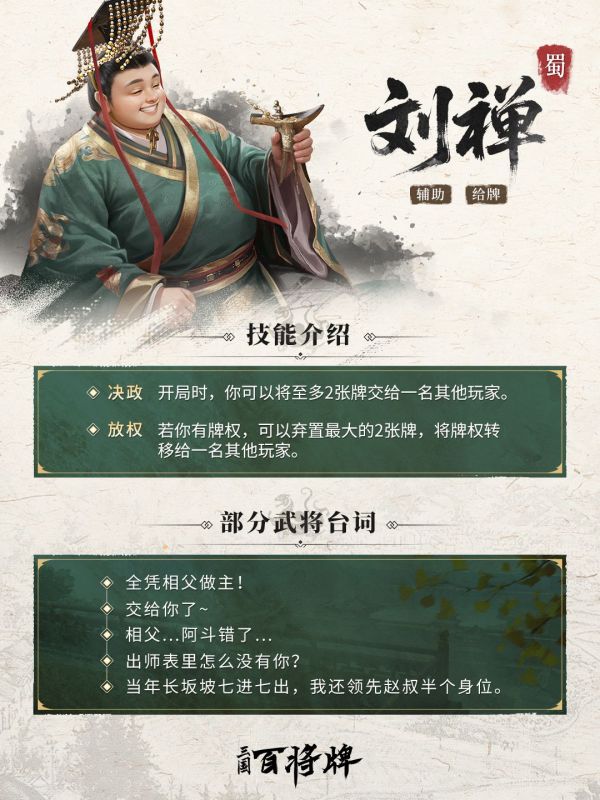 ◆技能简介:在《三国:百将牌》中,刘禅是一位以辅助为核心的策略型武将。其核心玩法围绕“以牌换势”,开局阶段,刘禅可发动技能将至多2张牌交给一名其他玩家,奠定团队优势;当刘禅获得牌权时,可弃置自身最大的2张牌,将牌权转移给一名指定的其他玩家,化用其历史上“政事无巨细,咸决於亮”的管理方式,将个人资源转化为团队优势。