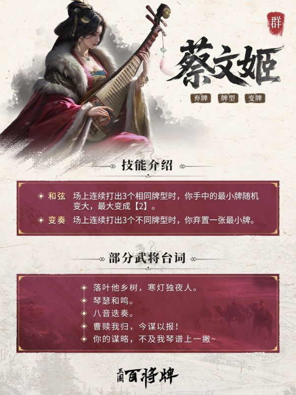 当场上连续打出三次相同牌型时,蔡文姬自动触发【和弦】技能,将自身手牌中的最小牌随机变大;