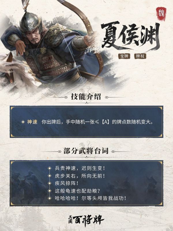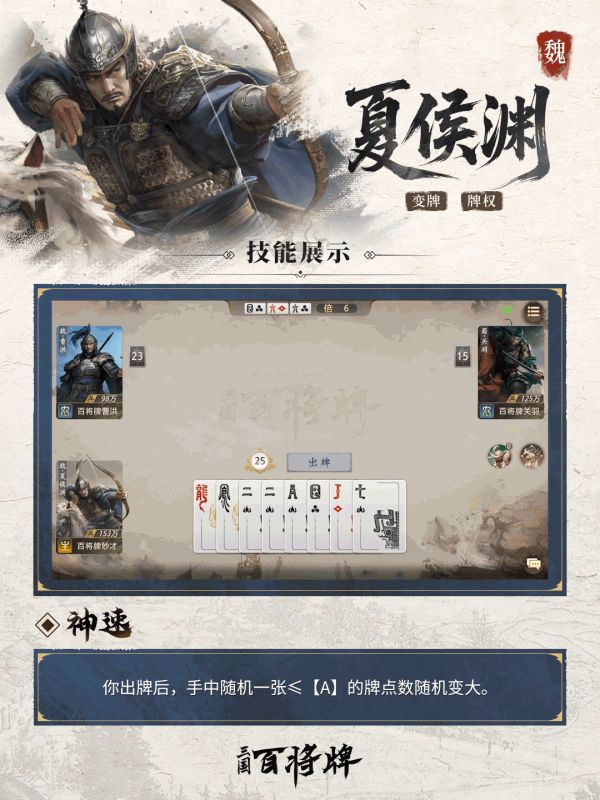 以速度压制敌人的战法,在《三国:百将牌》中,被凝炼为他的核心技能——【神速】:你出牌后,手中随机一张点数小于等于A的牌,其点数随机变大。