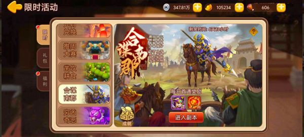 活动内容:活动期间开放“合谋南郡”限时副本,每日首通获得奖励。