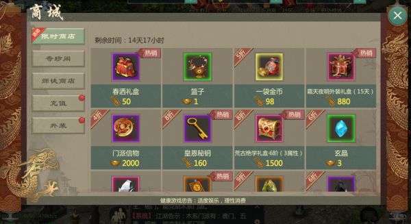 活动期间内,各位大侠可在商城内打开限时商店界面购买特惠活动商品,焕新上架大量道具礼包:混沌阳/阴、五行灵根及神兵材料,更有霜天夜明外装礼盒(15天)限时返场! (温馨提示:同时满足参与天下一帮赛事活动的大侠还可额外获得群雄令,群雄令活动将在3月17日23:59点结束)