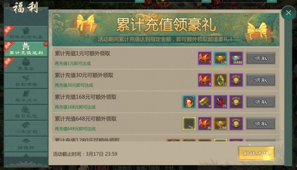 活动期间内,充值达到一定数额的大侠可在福利界面内打开累计充值界面领取累计充值奖励。(温馨提示:同时满足参与天下一帮赛事活动的大侠还可额外获得群雄令,群雄令活动将在3月17日23:59点结束)