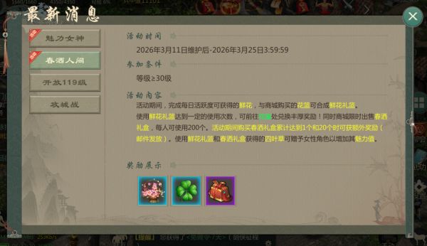 活动期间,等级≥30级,每日达到一定活跃度可在活跃度宝箱内获得【鲜花】,大侠可与限购商店购买的【篮子】在各大主城“花童”处兑换【鲜花礼篮】,使用【鲜花礼篮】可获得随机奖励,同时有概率获得【四叶草】(可用于赠送给女性角色获得排名奖励),使用一定数量的【鲜花礼篮】可在“花童”处领取额外奖励,活动期间限时商店更有【芳菲礼盒】出售(限时开启天下第一帮联动:3月17日23:59前在限时商店每消费20银票,即可为所在帮会增加1个群雄令积分同时获得1个群雄令)。