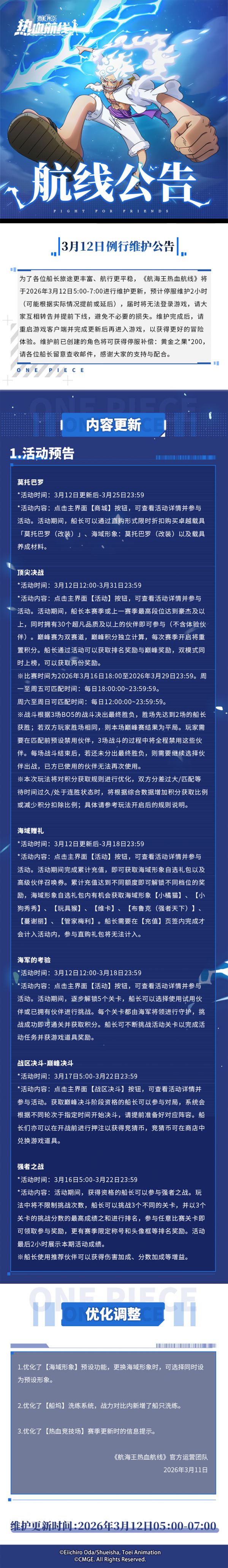 为了各位船长旅途更丰富、航行更平稳,《航海王热血航线》将于2026年3月12日5:00-7:00进行维护更新,预计停服维护2小时(可能根据实际情况提前或延后),届时将无法登录游戏,请大家互相转告并提前下线,避免不必要的损失。