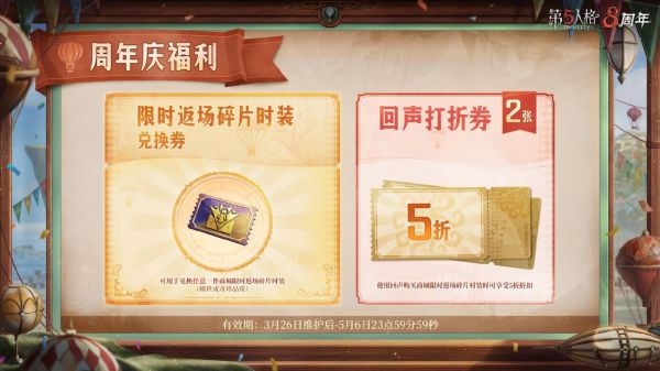 与此同时,还将送出以下惊喜福利!限时返场碎片时装兑换券×1:可在所有限时返场商城的碎片时装中任选一件进行免费兑换,稀世时装和奇珍时装均可使用!回声打折券×2:在购买所有返场的碎片时装时,可享受回声5折折扣!