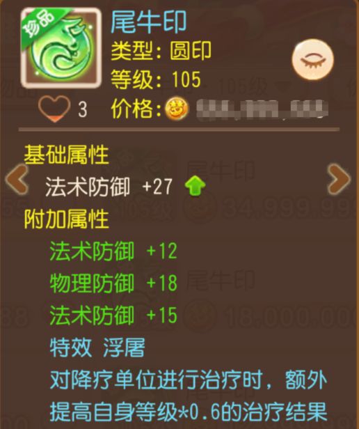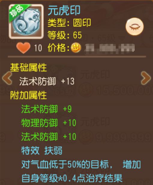 辅助玩家的“梦中情印”它来了!除了基础属性外,还附带3条防御属性。最核心的亮点在于“扶弱”特效——对气血低于50%的目标有额外的治疗结果加成。