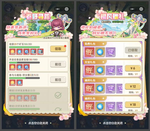 春野寻游活动持续期间,包含以下5个形式:任务、礼包、基金、小玩法、抽奖;分别为:【春野寻踪】、【樱风赠礼】、【春行补给】、【拾影成春】、【樱下祈愿】