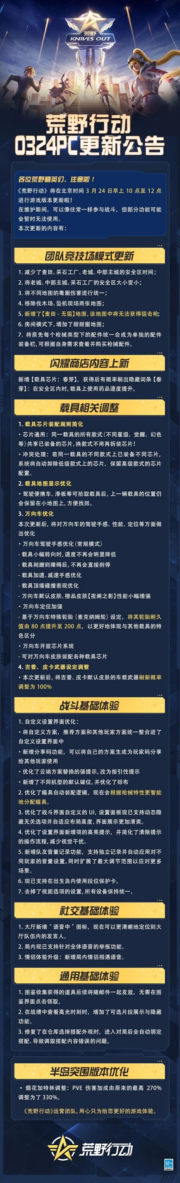 《荒野行动》将在北京时间3月24日早上10点至12点进行游戏版本更新啦!