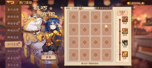 活动内容:活动期间,可通过消耗机关钥匙进行翻牌,翻到4个曹操即可进入下一关卡,通关关卡次数达到目标值即可获得奖励。