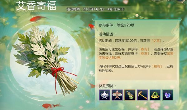 活动期间,少侠每日活跃度满100时将获得艾草,使用后可选择亲密度>=2的好友发送祝福,发送成功即可获得活动奖励。