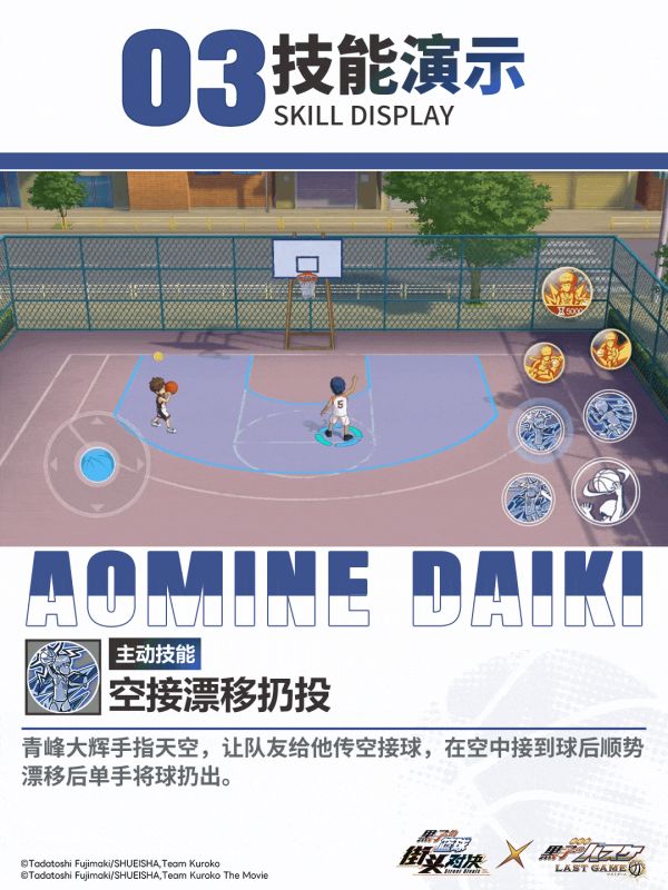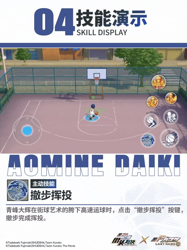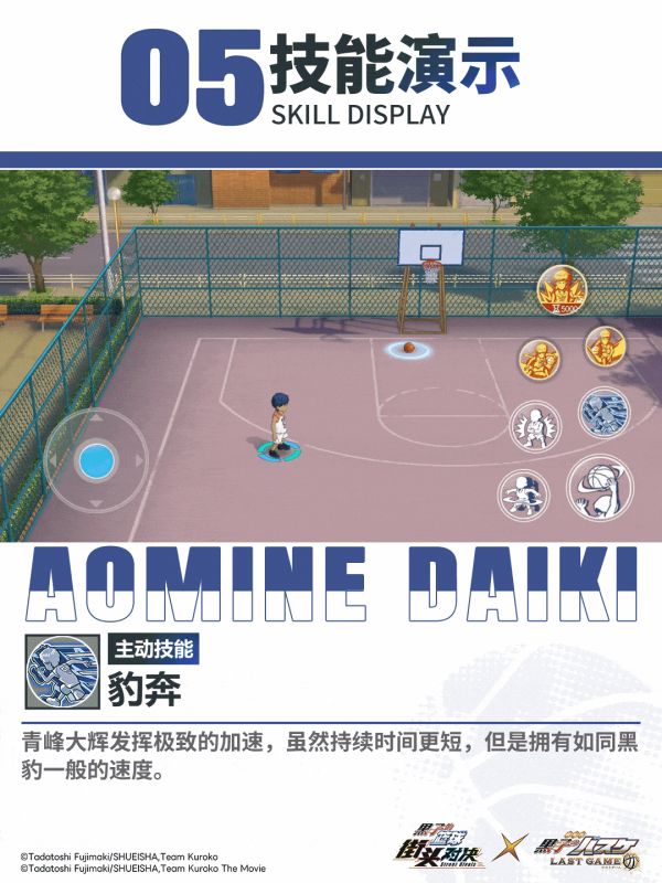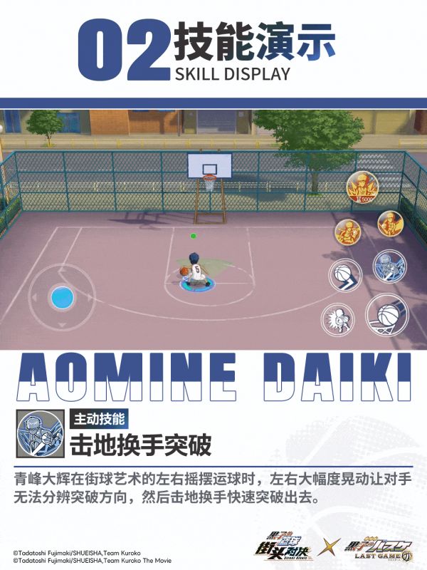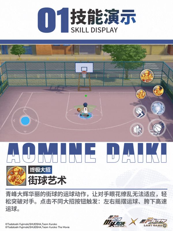 青峰大辉华丽的街球的运球动作,让对手眼花缭乱无法适应,轻松突破对手。点击不同大招按钮触发:左右摇摆运球、胯下高速运球。