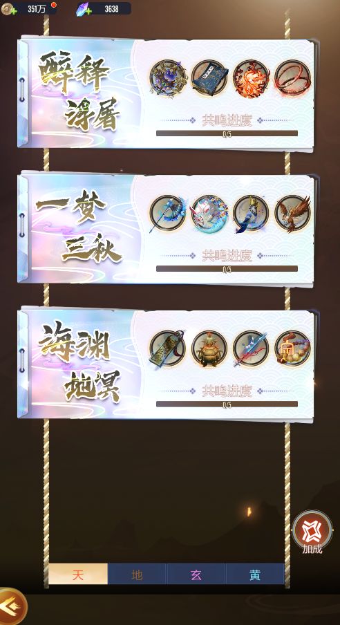 法宝聚灵共分为天、地、玄、黄四大组别,每个组别下各包含三套独立的法宝聚灵套装,四大组别梯度进阶,套装效果各有千秋,助力仙友全方位提升战力。