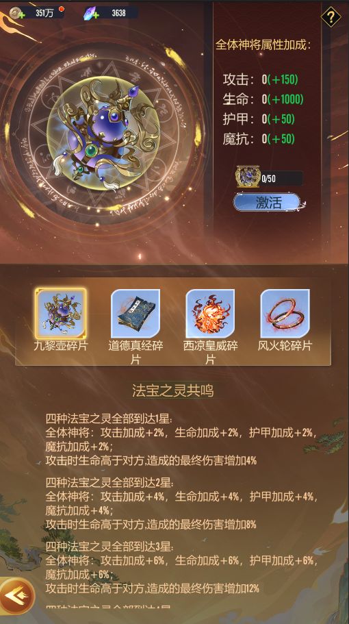 激活或升星法宝聚灵,可提升全体神将基础属性,同时解锁专属法宝聚灵技能,战力全面爆发。
