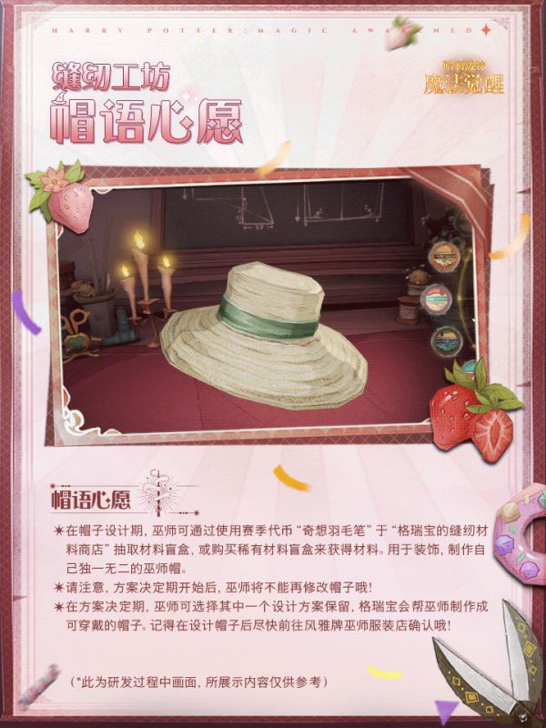 -在帽子设计期,巫师可通过使用赛季代币“奇想羽毛笔”于“格瑞宝的缝纫材料商店”抽取材料盲盒,或购买稀有材料盲盒来获得材料。用于装饰,制作自己独一无二的巫师帽。